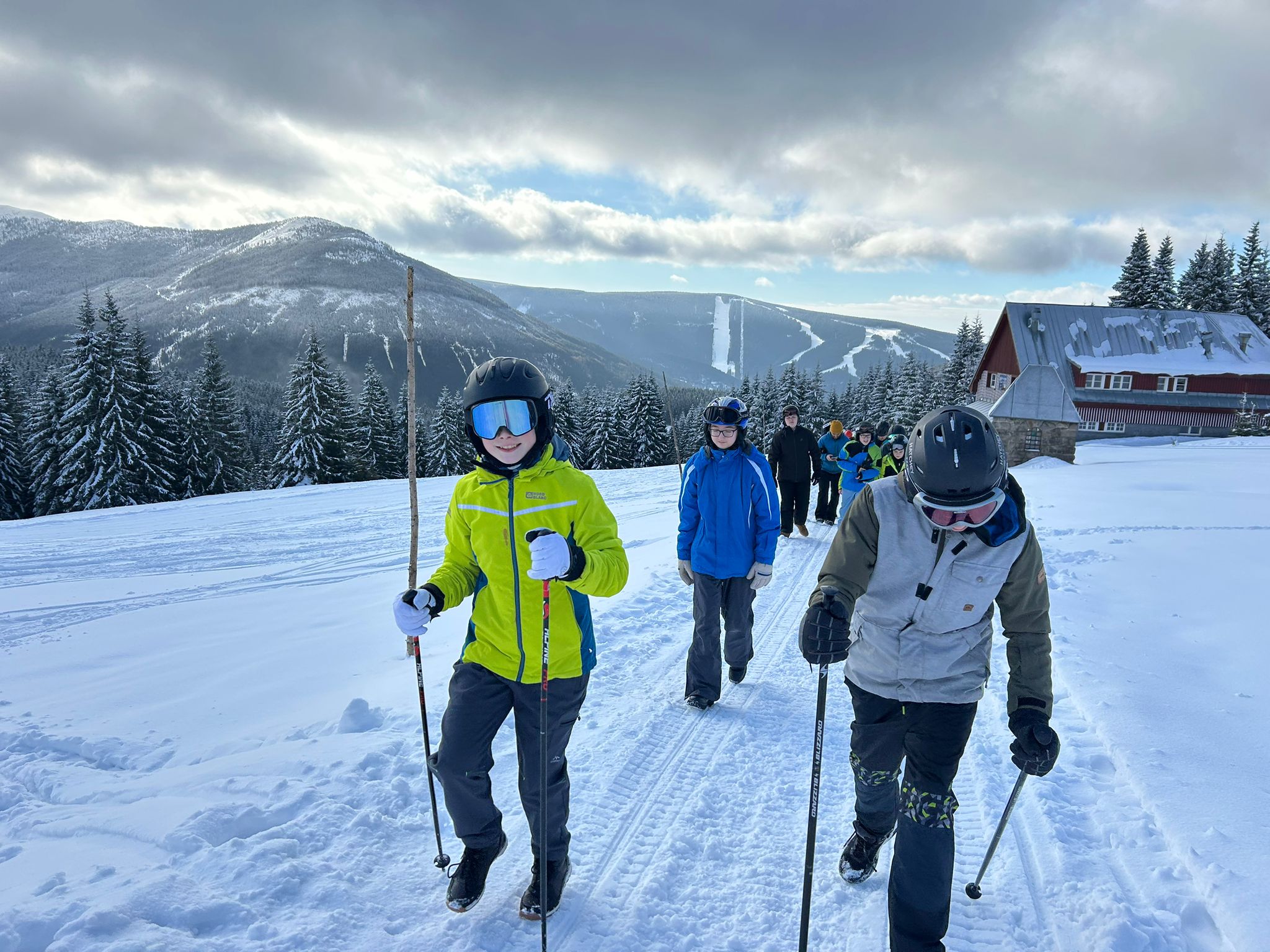 Poslední únorový týden patřil našim sedmákům. Výměnou za školní lavice získali čerstvý horský vzduch, zasněžené hřebeny a útulné zázemí chaty Sedmidolí, která se na týden stala jejich základnou.Hlavním bodem programu byl samozřejmě lyžařský výcvik. Ačkoliv se na začátku týdne někteří na lyžích spíše rozkoukávali, pod vedením našich instruktorů dělali všichni obrovské pokroky. Lyžování ale nebylo to jediné, co nás čekalo. Vyzkoušeli jsme si také běžecké lyžování, které prověřilo naši fyzičku i smysl pro rovnováhu (a u některých i smysl pro humor při prvních pádech do sněhu). Když jsme si potřebovali od lyží na chvíli odpočinout, vyrazili jsme na pěší výlet na Špindlerovu boudu. Odměnou nám byly nádherné panoramatické výhledy na krkonošské hřebeny.Kurz ale nebyl jen o sportu. Společné večery na chatě, hry, smích a utužené kolektivy jsou přesně to, co si ze Sedmidolí vezeme domů. Sedmáci ukázali, že jsou skvělá parta, která se umí podržet na svahu i mimo něj.